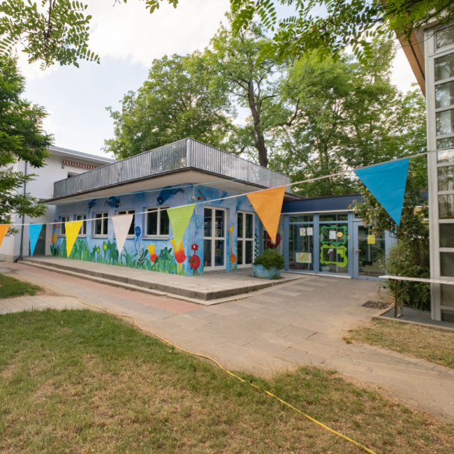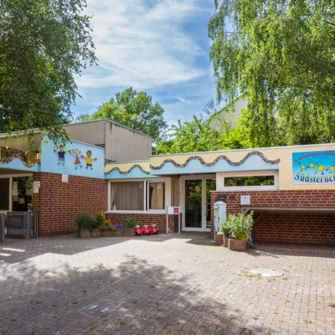 In der von der Straße zurückgesetzten Kita Südsternchen in der Frankfurter Straße 78b, mit vor gelagertem Spielplatz, betreuen wir bis zu 66 Kinder im Alter von 18 Monaten bis zum Schuleintritt. Dafür stehen drei Ganztagesgruppen mit Früh- und Spätdienst zur Verfügung. Die Integration von Kindern mit Behinderung oder drohender Behinderung wird seit vielen Jahren umgesetzt und findet weiterhin, je nach Bedarf, Berücksichtigung.