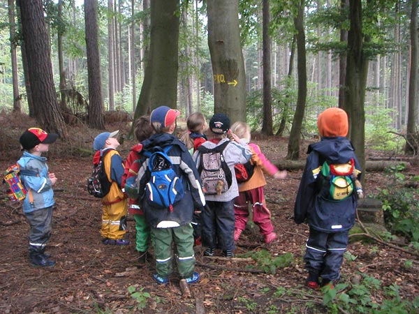 Eine weitere Besonderheit der Konzeption ist die Umsetzung der Waldpädagogik. Zu Beginn des Kindergartenjahres bildet sich eine Waldgruppe, bestehend aus 16 Kindern. Diese Gruppe verbringt das ganze Jahr, gemeinsam mit zwei Fachkräften, drei Vormittage pro Woche im Kaufunger Stiftswald. Während dieser Zeit haben die wenigen Kinder, die im Haus verbleiben, die Möglichkeit, die Kindergartenräumlichkeiten und den Garten größtmöglich zu nutzen.